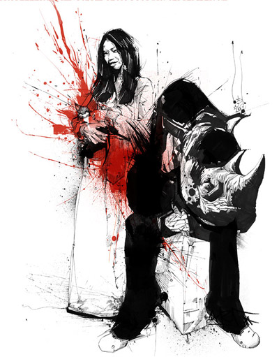 “they begin life as sketches in ink, the tool of choice is the Bic ‘fine’ because it gives me a lot more mileage than more expensive, snootier fine liners that break if you give them too much stick. The sketch is transported into my ageing mac and then abused in photoshop (you may have heard of it) i use this because of the joy of multiple undo’s plus its the closest I can get to painting without painting.”